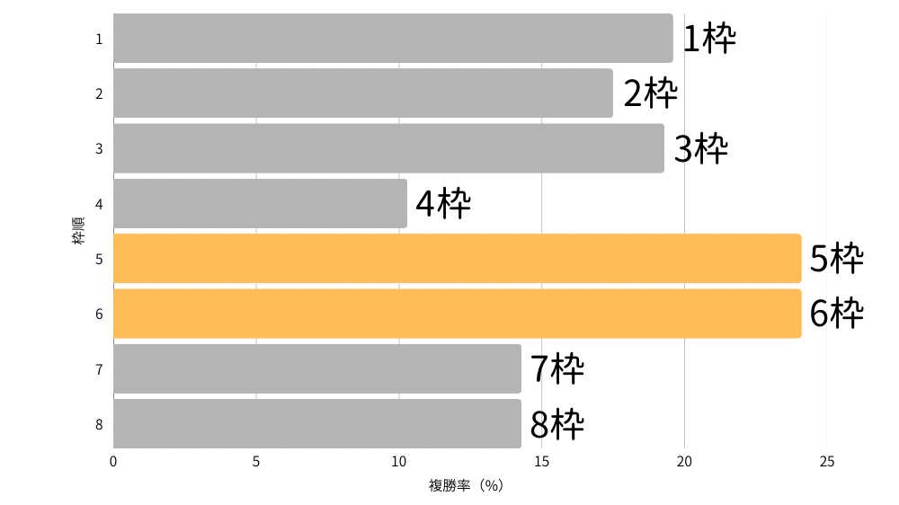 ・5枠・6枠の複勝率が高い、内枠・外枠の優位差は少ない