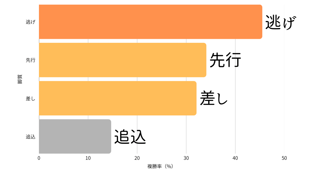 ・逃げ・先行・差し馬の成績が高く、追込馬がやや苦戦傾向
