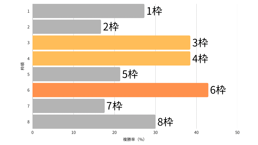 ・3枠・4枠・6枠の成績が良く、枠順による優位差は少ない