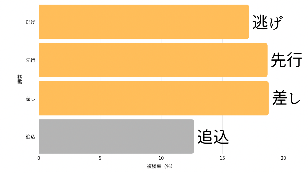 ・先行・差し馬の成績がやや高く、追込馬がやや苦戦傾向