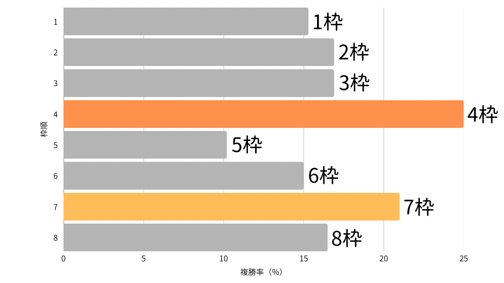 ・4枠の成績が頭一つ抜けているが、枠順による優位差は少ない